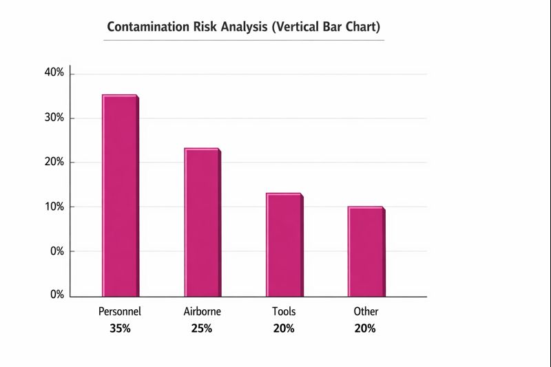 উল্লম্ব বার চার্টটি দেখায় যে কর্মীদের চলাচল পরিষ্কারকক্ষে ক্রস-দূষণে সবচেয়ে বেশি অবদান রাখে, সঠিক গাউনিং এবং মোছা পরিচালনার উপর জোর দেয়।