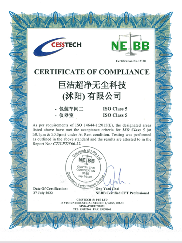 শীর্ষস্থানীয় ক্লিনরুমের মান: 2018 সালে নির্মিত শুইয়াং কারখানাটি আইএসও ক্লাস 5/6 ক্লিনরুমের মানগুলিতে নির্মিত এবং এটি এনইবিবি-প্রত্যয়িত। এর 8,000 বর্গমিটার লিন্ট-মুক্ত কর্মশালা উচ্চ-শেষ, লিন্ট-মুক্ত, নিম্ন-কণা গ্রাহকযোগ্য উত্পাদন সক্ষম করে।