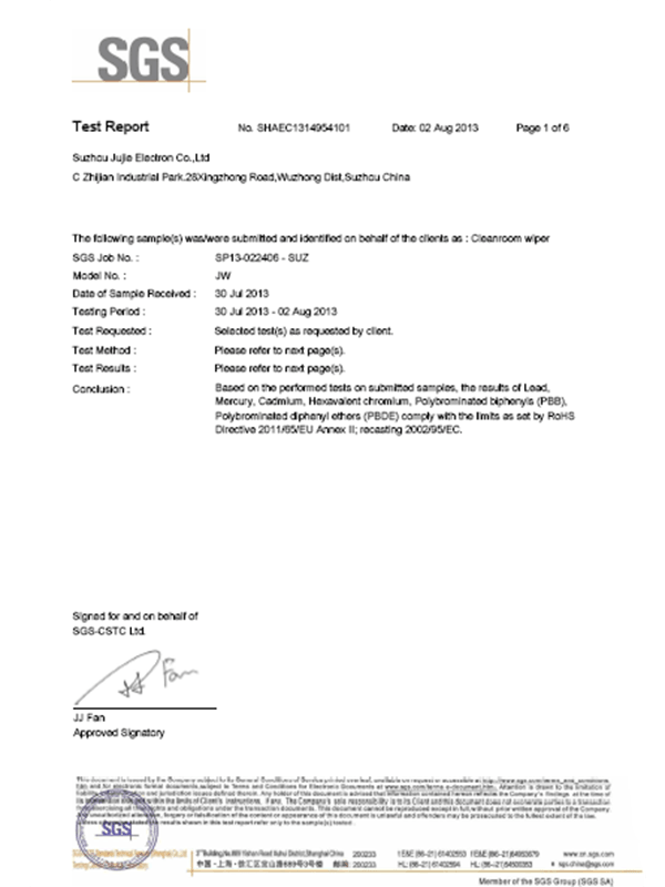 পণ্যটি ক্লিনরুম শিল্পের শংসাপত্র পাস করেছে কিনা তা পরীক্ষা করে দেখুন। সুজু জুজি ইলেক্ট্রনিক্সের সমস্ত গ্রাহ্যযোগ্য আইএসও ক্লাস 5/6 স্ট্যান্ডার্ড পূরণ করে এবং তৃতীয় পক্ষের পরীক্ষার প্রতিবেদন সরবরাহ করে।